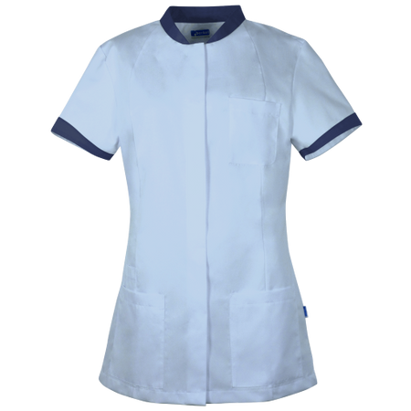Damesjack De Berkel Fleur is een getailleerd model met opstaande boord, verdekte drukknoopsluiting, korte mouw met stretch inzetstukken voor meer bewegingsvrijheid, 1 borstzak, 2 zijzakken binnen met sleutellus en rechts met telefoonzak, zijsplitten.