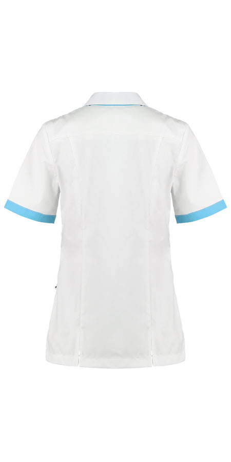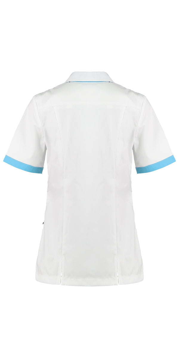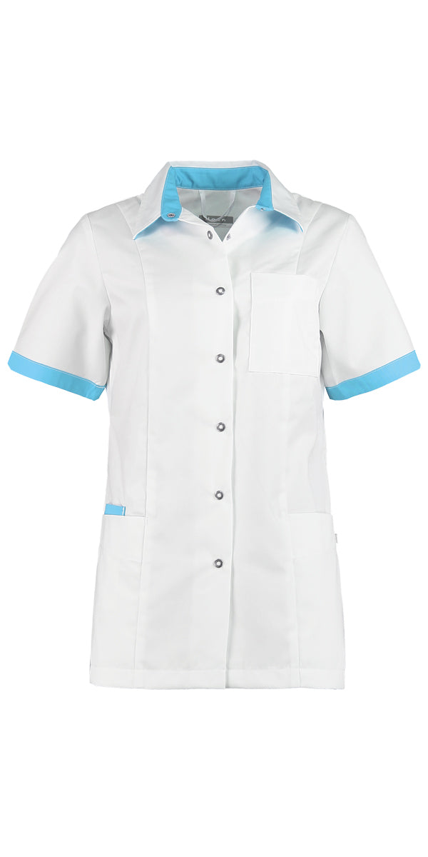 Getailleerd damesjack met open kraag, contrastdetails, borst- en telefoonzak, splitjes achter, 70 cm lang