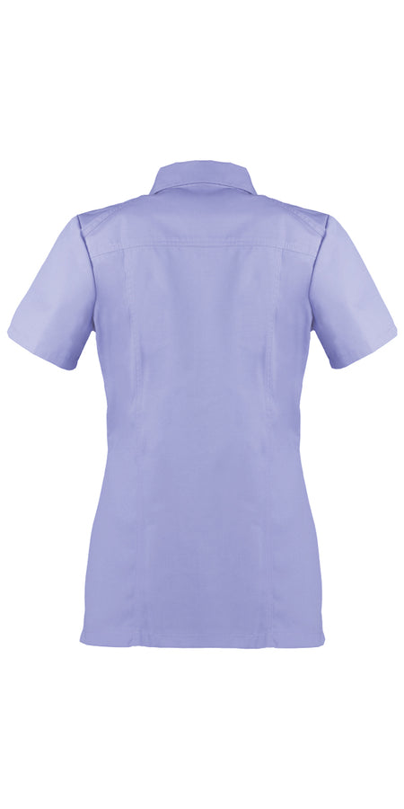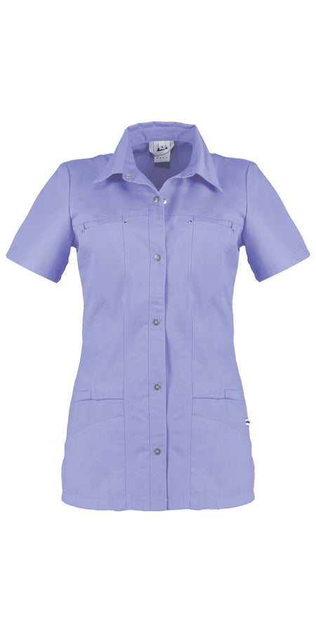 Damesjack met getailleerde pasvorm en jeanslook, openvallende kraag, sluiting door middel van moderne drukkers, moderne borstzakjes met rivets, 2 opgestikte zakken, telefoonzakje, 2 zijsplitjes, lengte ca. 70cm