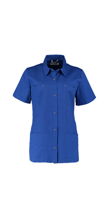 Getailleerd damesjack met jeanslook, moderne drukkers, borstzakjes en telefoonzak, royal blue, ca. 70 cm lang