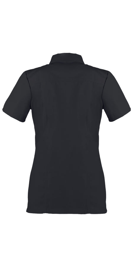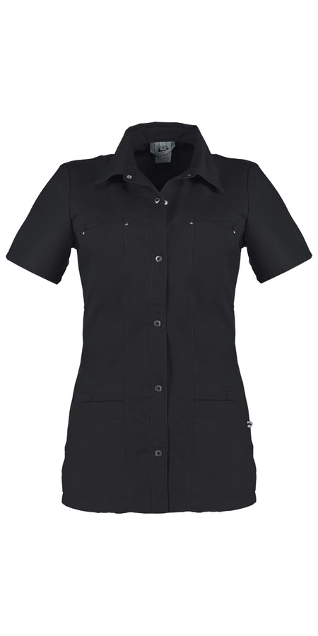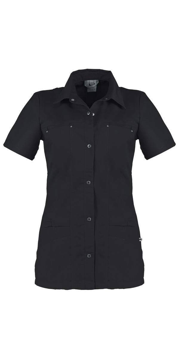Damesjack met getailleerde pasvorm en jeanslook, openvallende kraag, sluiting door middel van moderne drukkers, moderne borstzakjes met rivets, 2 opgestikte zakken, telefoonzakje, 2 zijsplitjes, lengte ca. 70cm