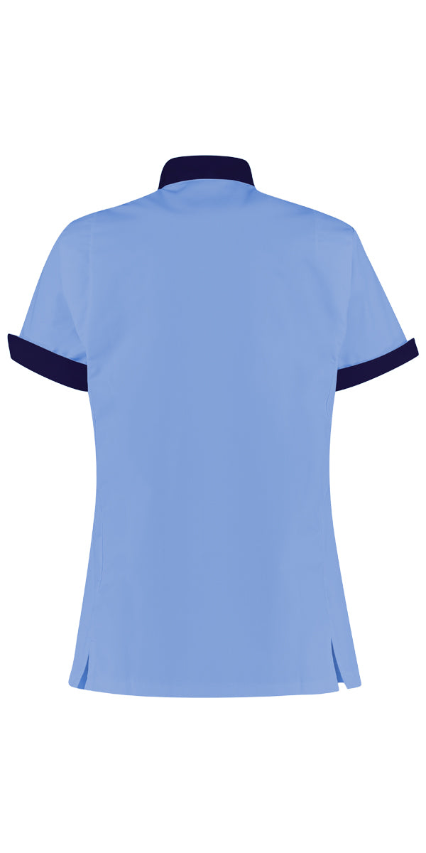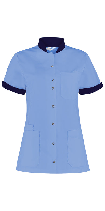 Damesjack met moderne pasvorm, opstaand boordje, diverse contrastdelen, drukknoopsluiting, 1 borstzakje met pennenzakje, 2 ruime heupzakken waarvan een met telefoonzakje en de ander met extra opgezet zakje, 2 zijsplitjes en telescoopmouw met tricot voor extra bewegingsvrijheid, omslag mouw met contrast en splitje, jaslengte ca. 72 cm.