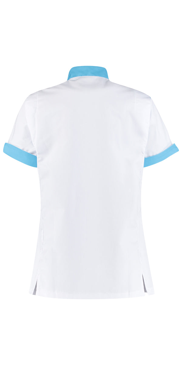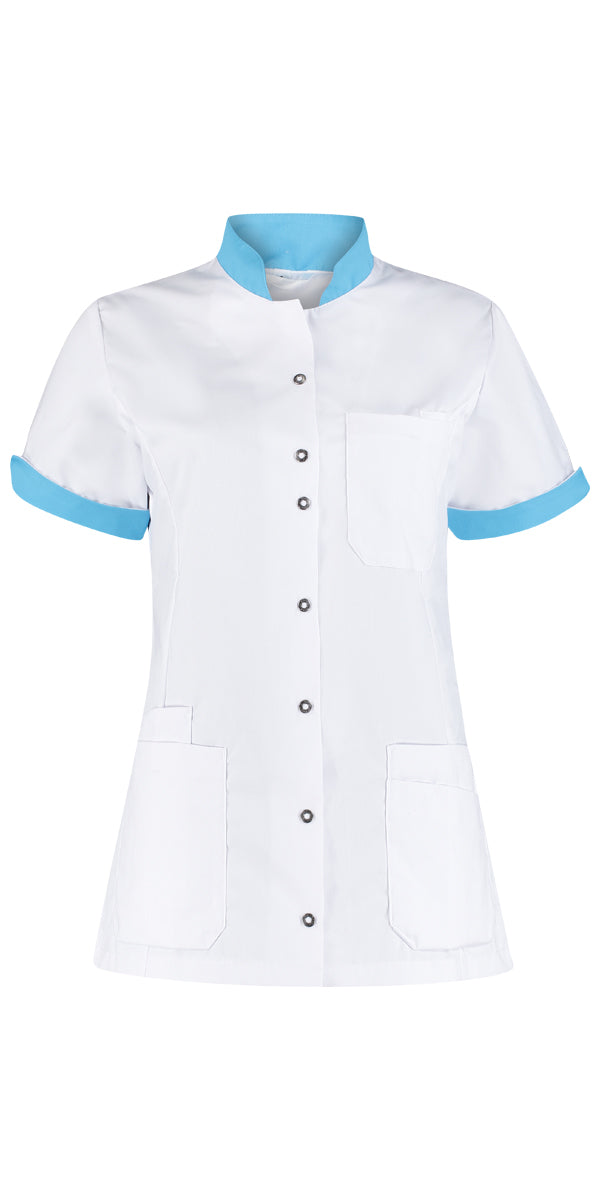 Damesjack met moderne pasvorm, opstaand boordje, diverse contrastdelen, drukknoopsluiting, 1 borstzakje met pennenzakje, 2 ruime heupzakken waarvan een met telefoonzakje en de ander met extra opgezet zakje, 2 zijsplitjes en telescoopmouw met tricot voor extra bewegingsvrijheid, omslag mouw met contrast en splitje, jaslengte ca. 72 cm.
