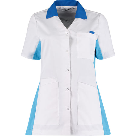 Comfort en elegantie gecombineerd in uw nieuwe favoriete tuniek! Dat is waar SHAE voor staat. Het basic model Luna heeft een perfecte op het lichaam aansluitende pasvorm. Het tuniek is voorzien van 4 zakken waaronder een handige universele telefoonzak, twee zijsplitten, een V-hals met een staande kraag en een praktische doorknoopsluiting. Het tuniek is uitgevoerd in een speciaal geselecteerde gerecycled polyester met katoen. De mouwen kunnen bij warmere temperaturen omgeslagen worden. Het tuniek Luna is zowel thuis als industrieel te wassen.