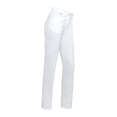 Sportieve slankere damespantalon met jeans-look, meerdere zakken, dijbeenzak, accenttrensjes in grijs, gedeeltelijk elastiek in tailleband en uitgevoerd in comfortabele stretch kwaliteit.