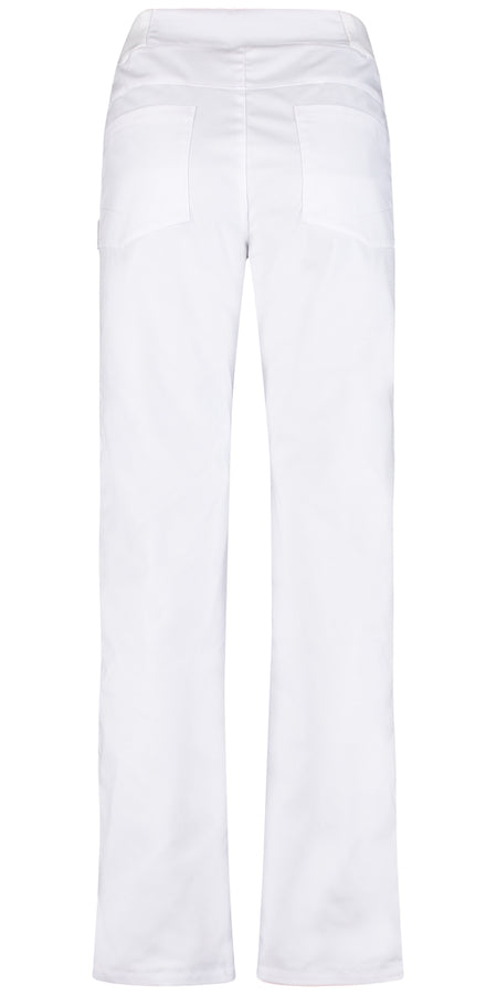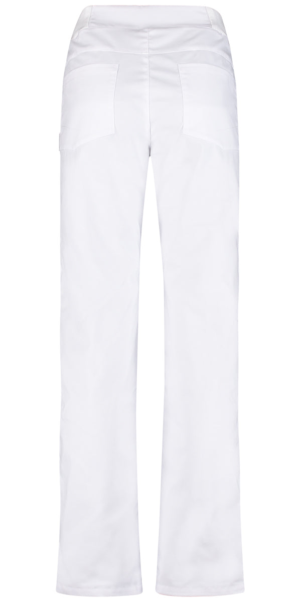Pantalon met moderne pasvorm, uitgevoerd in stretch, hoge tailleband, deels elastische tailleband, dubbele stiftknoop, gulp drukknoopsluiting, 2 steekzakken, 1 muntzakje en 2 achterzakken, binnenbeenlengte ca. 84 cm.
