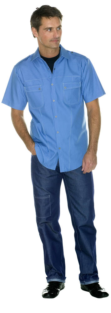 Unisex jack in ton sur ton- streep met korte mouwen, dubbele ronde borstzak met klep, epualetten, schuine deelnaden, rond telefoonzakje op zijnaad, sierstiksels en zijsplitten