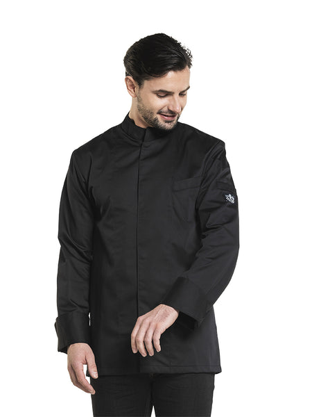 Stijlvolle koksbuis met blinde sluiting, satijnbinding, borst- en mouwzakjes voor optimaal comfort en professionele uitstraling