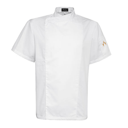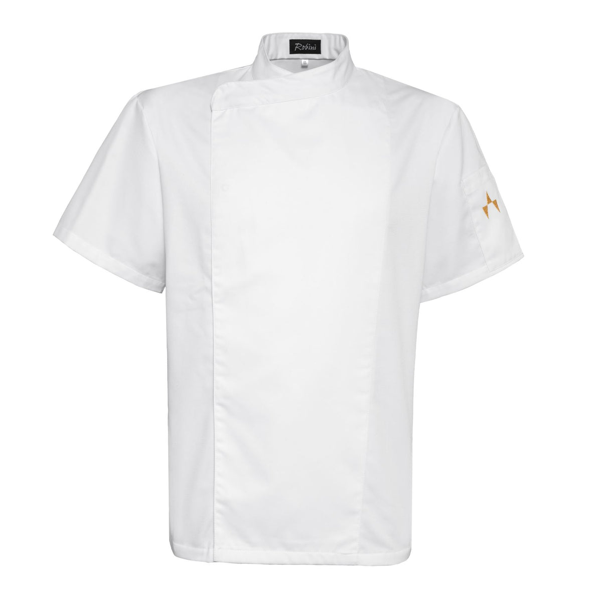 Koksbuis met drukknoopsluiting en korte mouw met een pennenzakje.