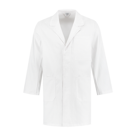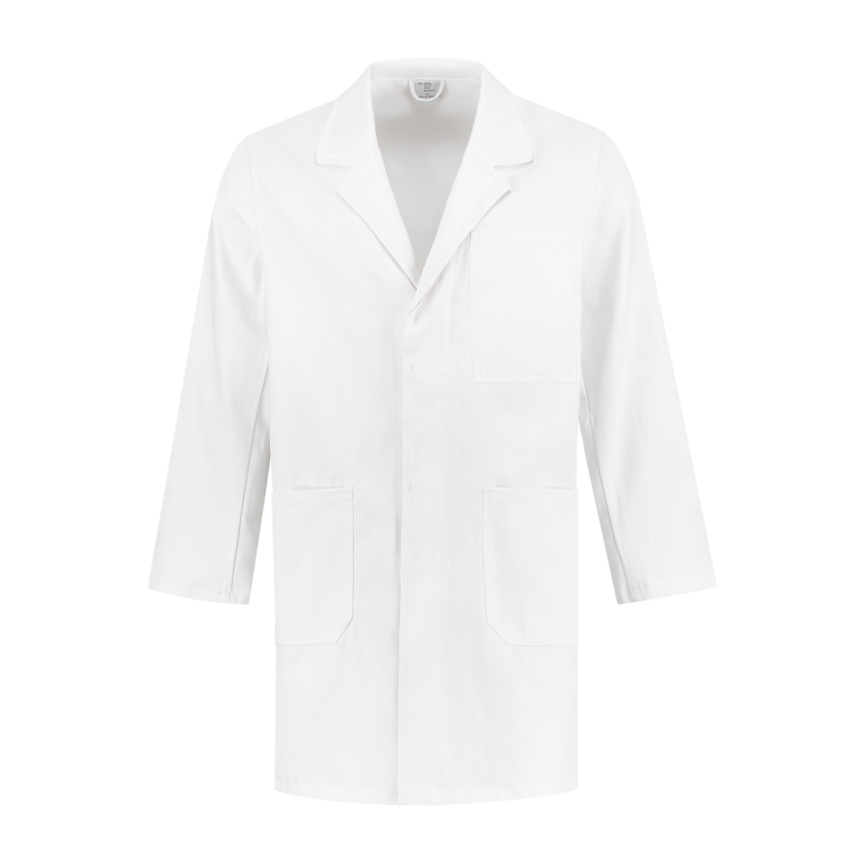 Labjas van 100% katoen, wit met drukknoopsluiting, zijzakken, borstzak, maten XS-3XL