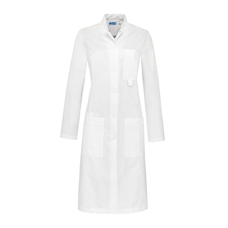 Getailleerde dames labjas met prinsessenlijn, zakken voor telefoon en pen, lange mouwen, ideaal voor medische professionals