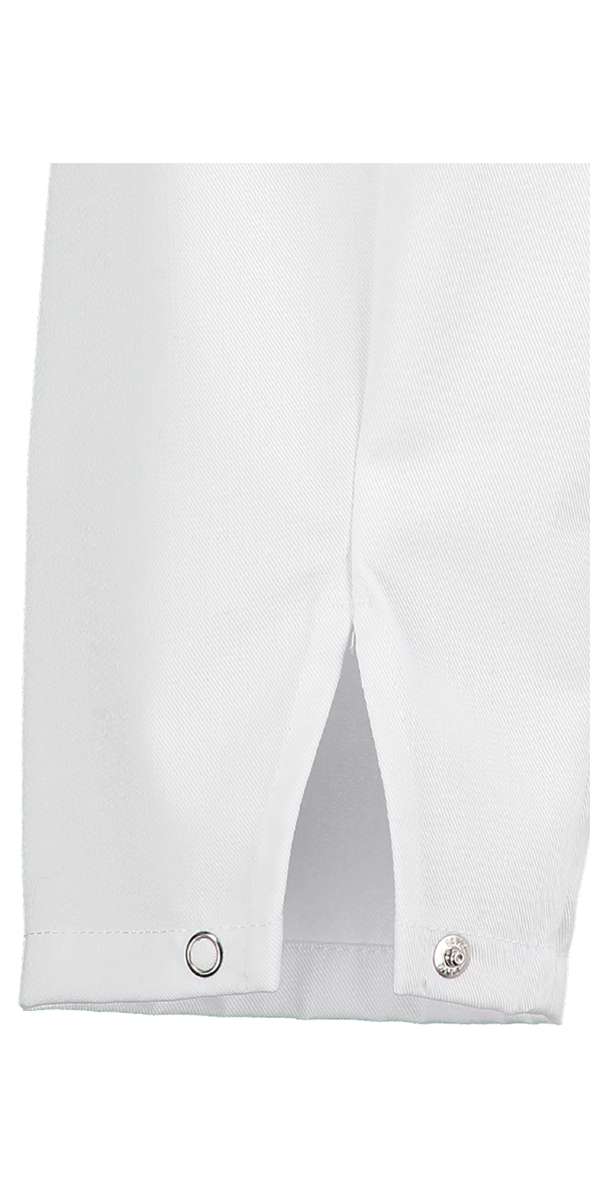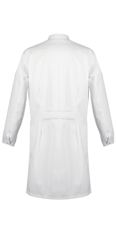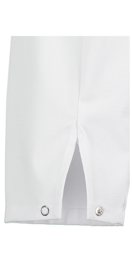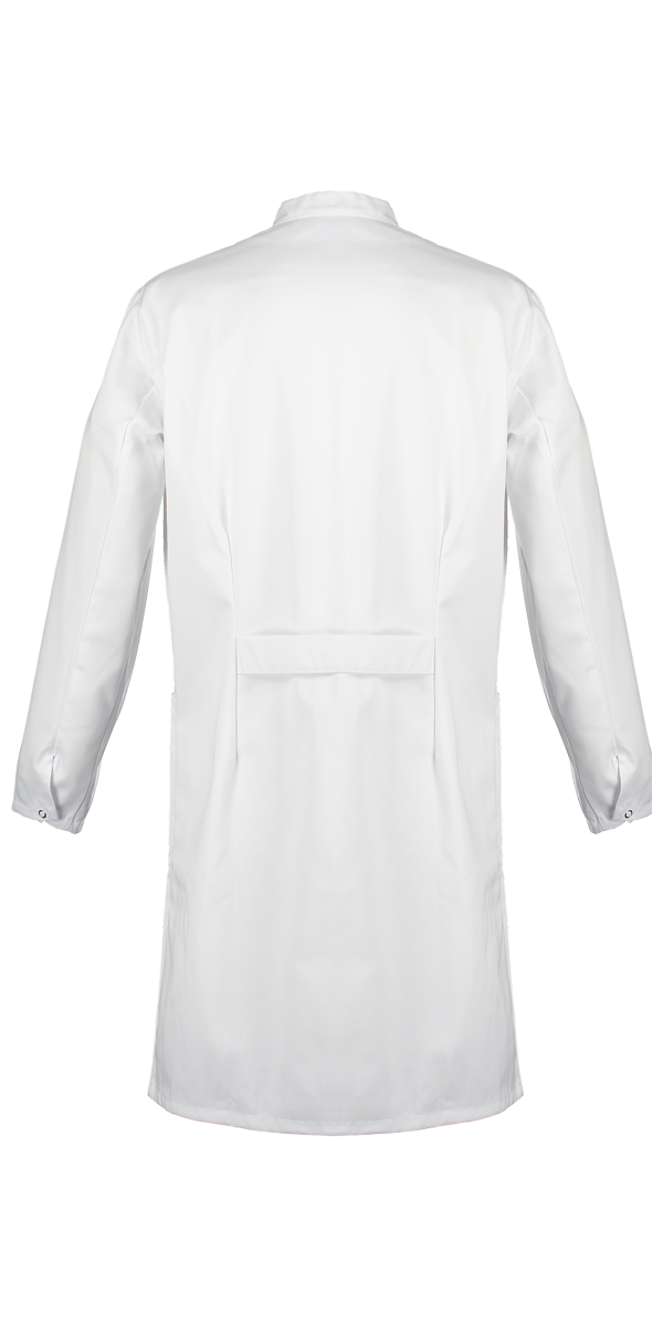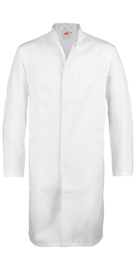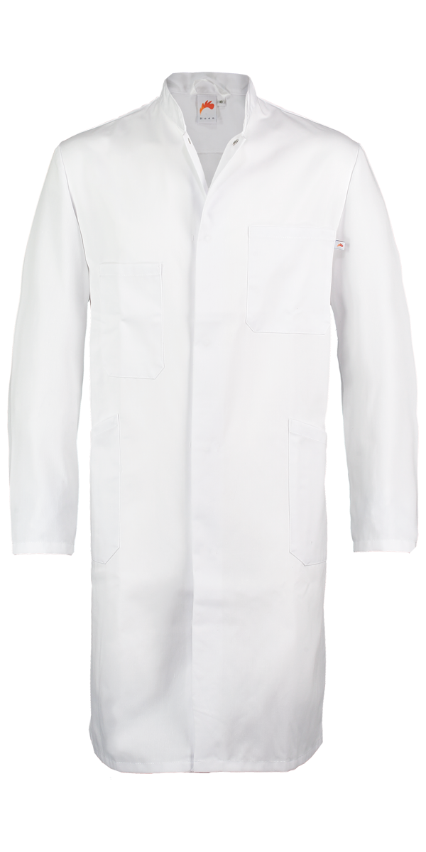 Verplegersjas Haen Ramon: Recht model, verdekte drukknoop, opstaande boord, zakken, rugceintuur, maten 44-62, lengte 103 cm